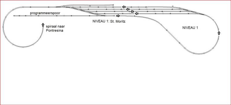 Het op de tekening onderste kopspoor is voor de Allegra. Deze pendelt tussen Tirano en St. Moritz. Er kunnen 4 getrokken treinen staan in de keerlus-plus-2-kopsporen. Nadat de twee opstelplekken in de keerlus bezet zijn gaat de volgende trein een kopspoor op en rijdt achteruit het andere (dikgedrukte) kopspoor op. De volgende trein rijdt het kopspoor en wacht tot het andere, dik gedrukte kopspoor vrij is, etc. Deze oplossing is gekozen uit plaatsgebrek, maar werkt prima en automatisch via het programma Koploper.